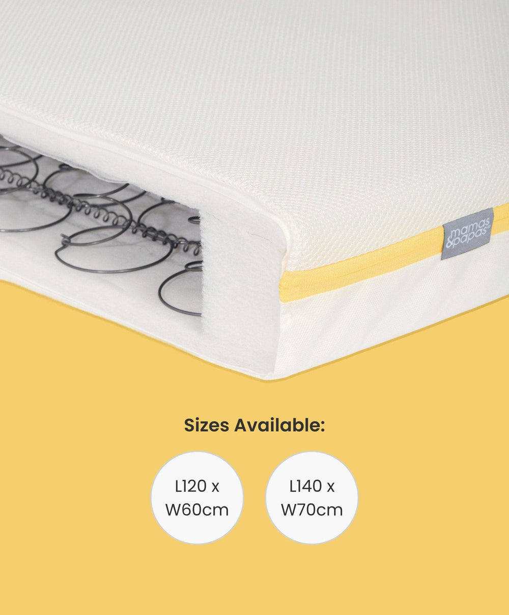 Essential, but far from basic. Because at Mamas & Papas we set the bar higher than the average, the Essential range boasts quality features as standard. Mamas & Papas Essential Spring cotbed mattress is the perfect traditional spring mattress for your little one. Designed to fit all Mamas & Papas cotbeds measuring 140x70cm.