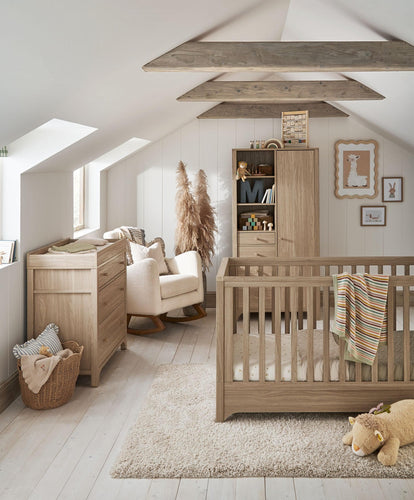 Crafted with a beautifully simple design and a natural oak finish, Barton brings a cosy, classic look to any nursery space. The collection includes a cotbed, dresser changer, and wardrobe. All designed to grow with your baby from newborn to toddler and beyond. With thoughtful details like soft curved feet, adjustable storage, and removable changing tops, each piece offers practical functionality without compromising on style. Choose the full Barton 3-piece set or mix and match individual pieces to suit your space and style.