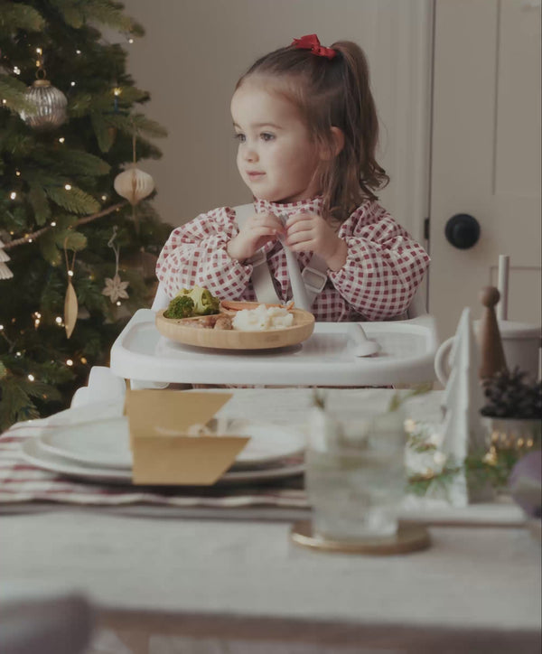 Perfect for Christmas dinner and festive crafts, this handy 2-pack of long-sleeved Christmas bibs with catch pockets keeps their clothes gravy-spill- and paint-free. Made from recycled polyester with a soft knit back that’s gentle on skin and PU coating for easy cleaning. Elasticated sleeves and two adjustable popper fastenings ensure a comfortable fit from around 6 months to 18 months old. Wipe clean and machine washable. In rich festive red gingham and Santa and friends print.