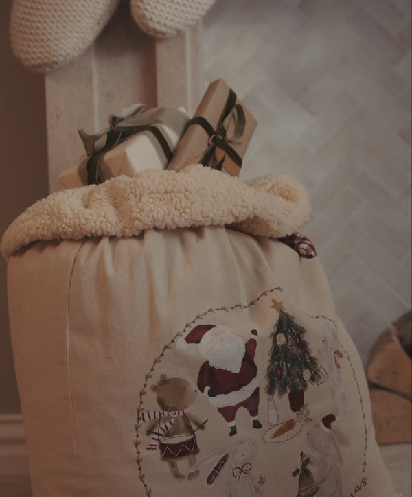 Make Christmas morning even more magical by delivering their presents in this beautifully illustrated Santa sack. Crafted from neutral calico fabric with a soft borg trim, it features a charming festive scene showing Santa with our beloved Christmas animal characters gathered excitedly around the tree. A detachable ‘2025’ hanging stocking adds a keepsake touch to commemorate the year.