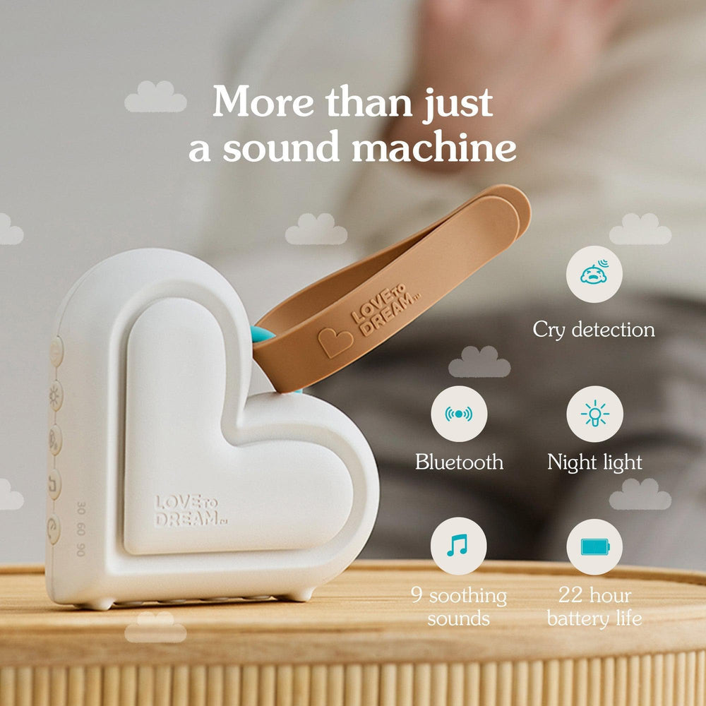 The Love To Dream Sleep Machine is an all-in-one baby sleep aid designed to create a calming and consistent sleep environment. Featuring nine soothing sounds, cry detection, a personalized recording function, and a baby-friendly night light, it helps babies fall asleep faster and stay asleep longer. With Bluetooth connectivity and a USB-C rechargeable battery lasting up to 22 hours, this sleep machine supports healthy sleep habits at home and on the go.