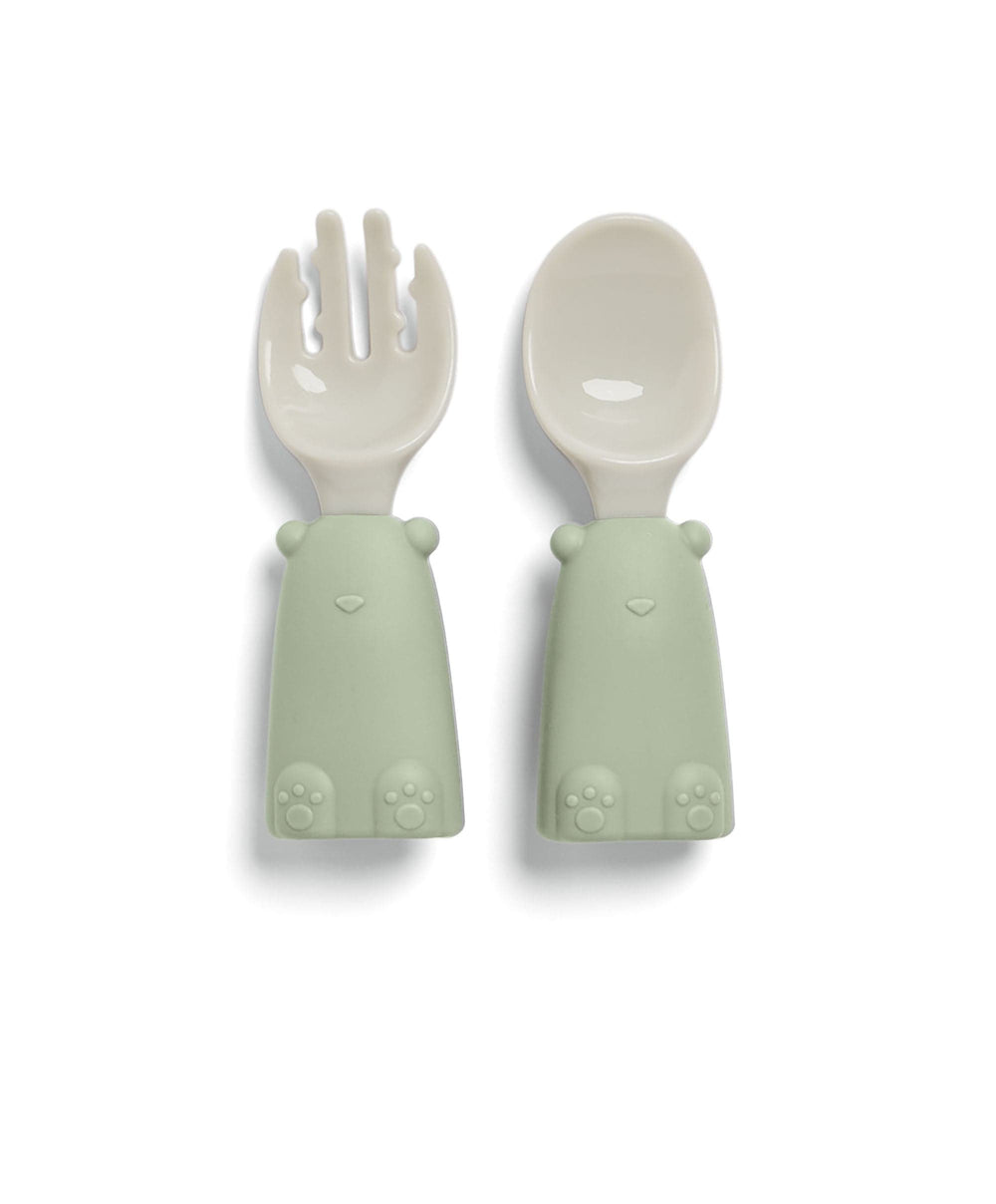 - Chunky short ended fork and spoon for developing grip and hand to mouth skills