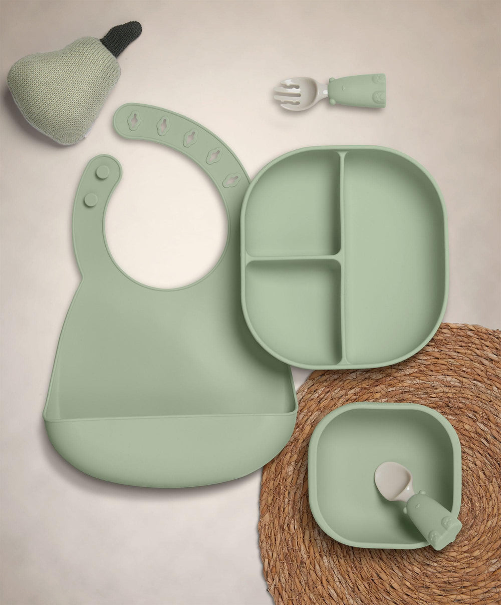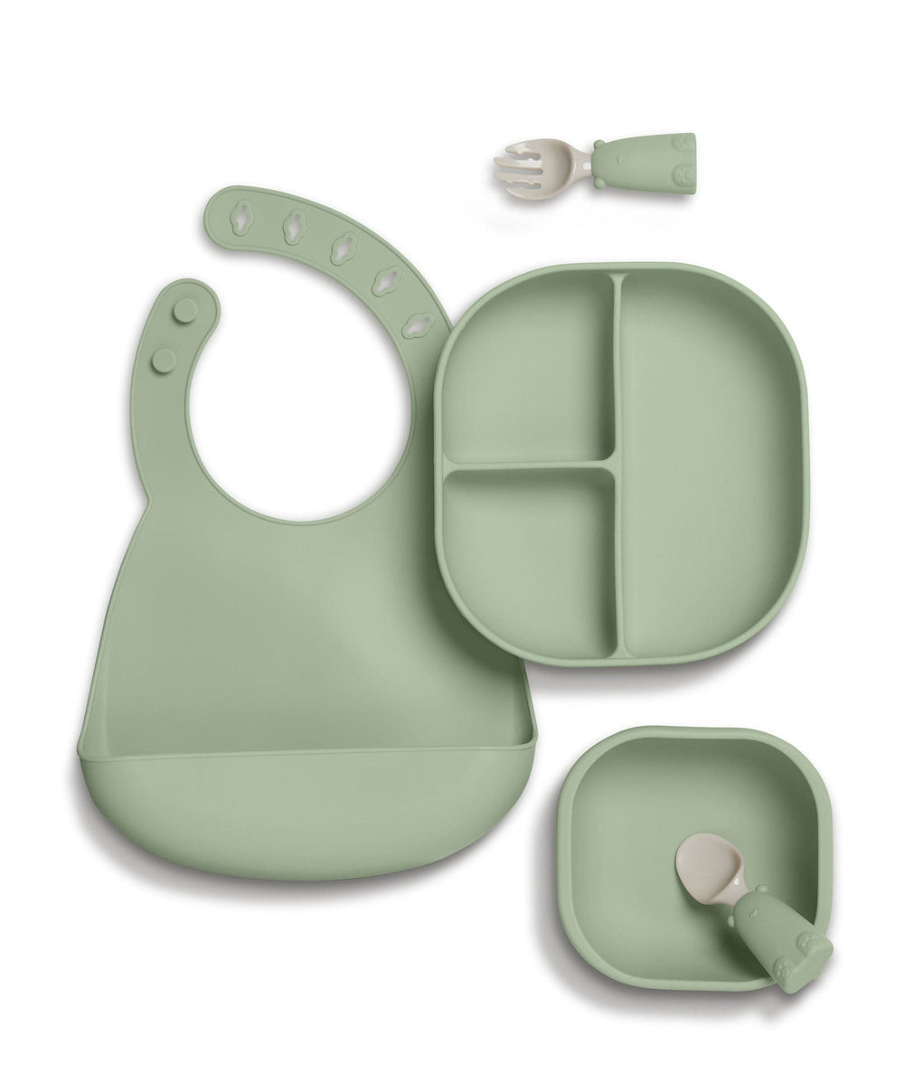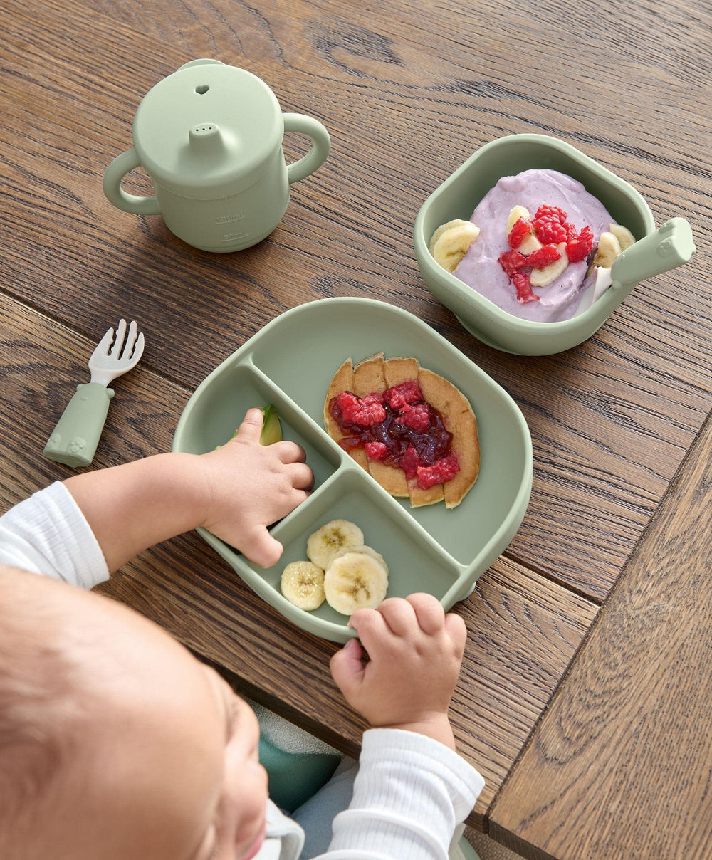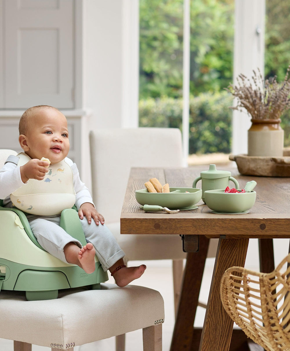 Everything you need for weaning. Includes suction-bottom sectional plate, to divide new tastes and textures; suction bowl; chunky short-ended fork and spoon ideal for developing grip and hand to mouth skills; and silicone bib for catching mess with multiple neck attachments to adjust as they grow. All made from odour-resistant, durable, dishwasher-safe and microwave-safe LFGB food grade Silicone. Available in 3 stylish colours - Kiwi, a muted green; Truffle, a warm neutral; and Melba, a soft blossom pink – that complement our wider highchair, booster seat and sippy cups, for a perfectly co-ordinated feeding experience.