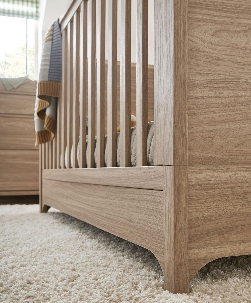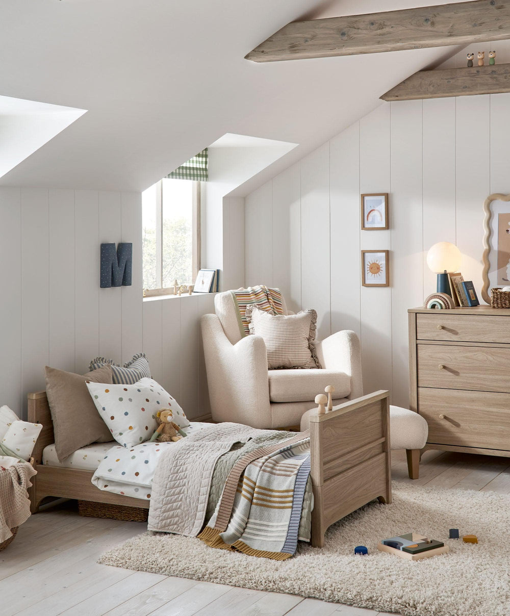 Your little one will enjoy the sweetest dreams in our Barton cotbed, designed to grow with them from newborn to toddler. With three adjustable base heights and simple conversion into a toddler bed, it will keep them sleeping soundly up to around 4 years old. With a warm natural oak effect finish, Barton’s beautifully simplistic design—with its soft curved-edge feet—fits effortlessly into any nursery style.