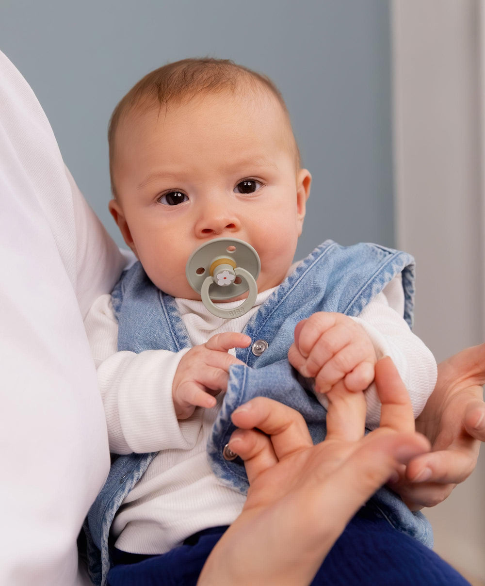 BIBS Colour is the original BIBS pacifier and has been on the market for over 40 years. It has the signature round BIBS shield with three vent holes and round BIBS engraved handle ring. The shield is carefully designed to curve away from the sensitive and delicate skin around the baby’s mouth to prevent moisture build-up. The shield is made of food-grade material.